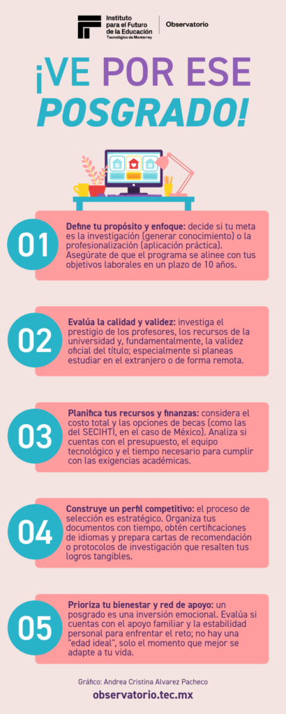 Considera la planificación financiera y logística como parte integral del proceso de selección. Si planeas postular a becas de excelencia, como las que otorga el SECIHTI, asegúrate de que el programa elegido esté debidamente acreditado y cumpla con los requisitos de dedicación exclusiva si es necesario. Ten mapeadas las fechas de cierre de convocatorias de financiamiento, ya que suelen ser independientes de las fechas de ingreso a la universidad. Toma en consideración que debes contar con los medios para continuar con tus estudios si el apoyo no te es otorgado.