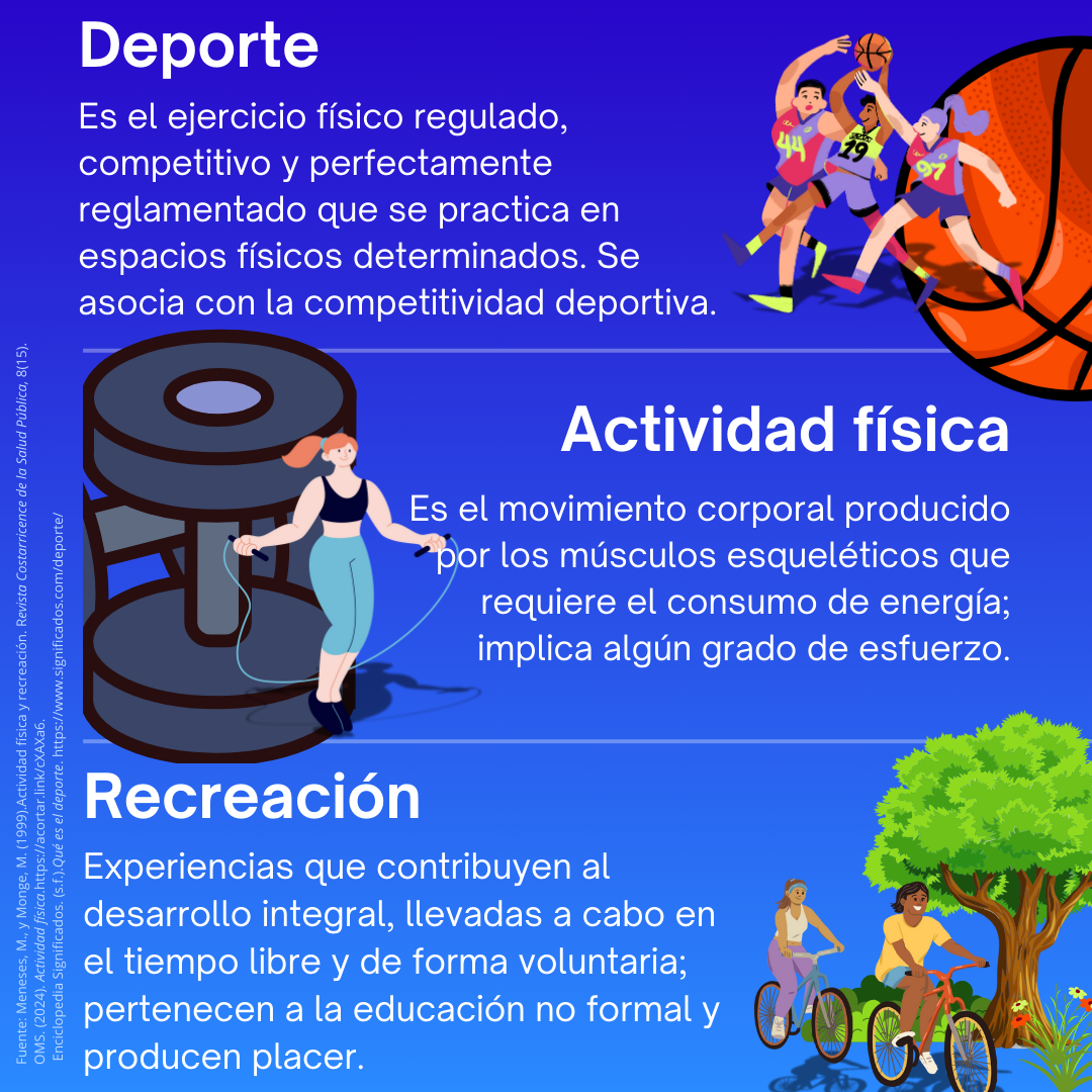 Antes de continuar, es importante comprender que los términos: actividad física, deporte y recreación implican cosas diferentes, por lo que no se pueden utilizar como sinónimos.