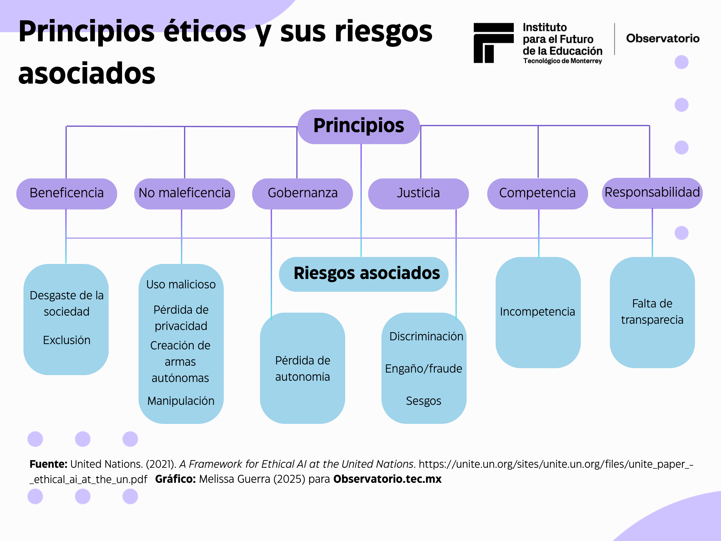 Por esta razón, es crucial hacer una recapitulación para entender los nuevos paradigmas éticos que se vislumbran gracias al uso de la IA generativa, por lo que es necesario recordar los principios éticos clave y los riesgos asociados a estos para comprender los cambios en el discurso ético actual. Para este fin, se utilizarán los principios que las Naciones Unidas establecieron en su reporte “A Framework for Ethical AI at the United Nations”, el cual ha sido también parte del debate entre expertos en el tema.