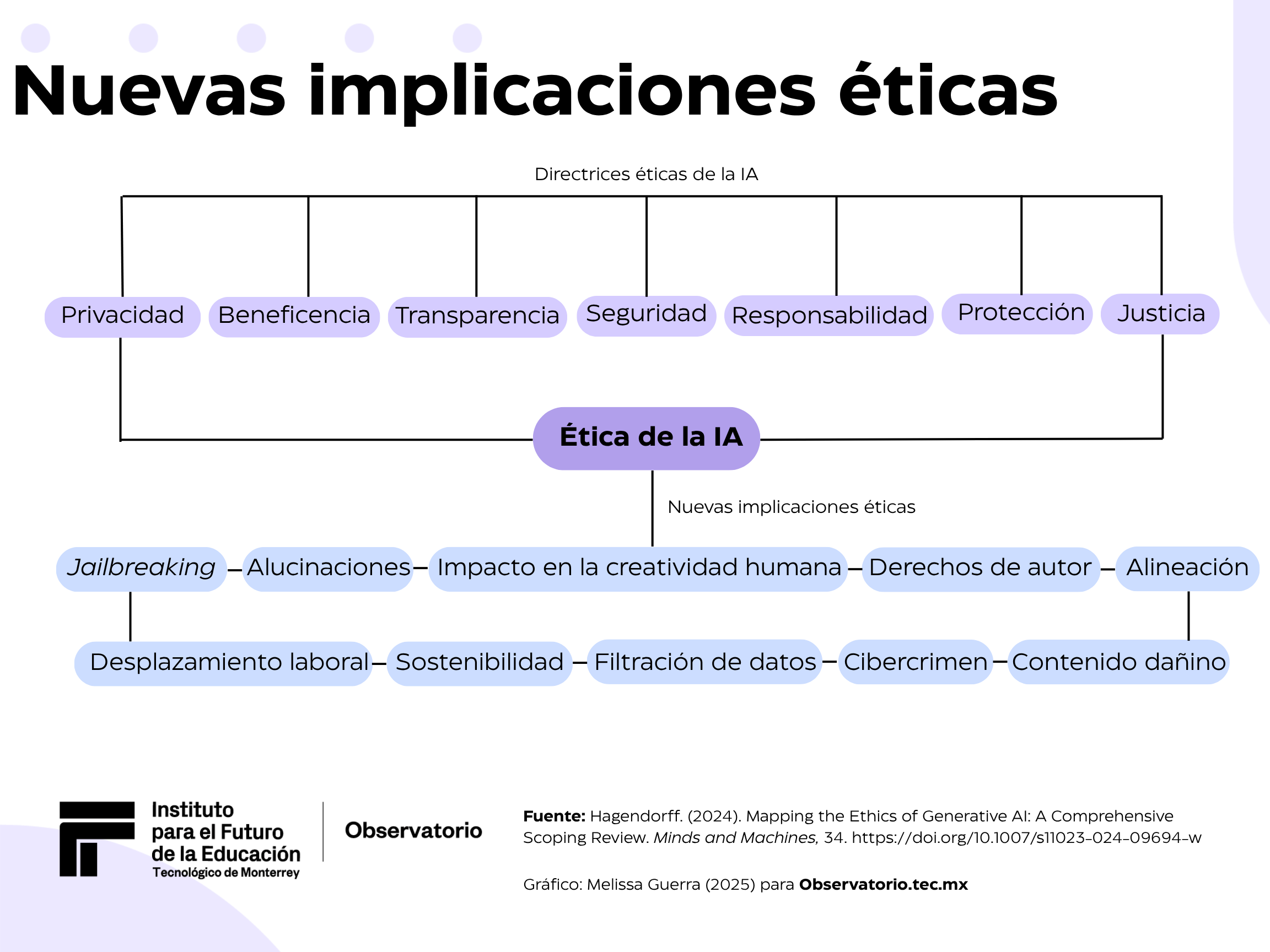Recapitulando, los principios establecidos por las Naciones Unidas: beneficencia, no maleficencia, gobernanza, justicia, competencia y responsabilidad, son de los términos más conocidos y generales de la ética de la IA. Sin embargo, este, como muchos marcos, datan de un pre-inicio de la IA generativa (ChatGPT fue lanzado en 2022; Gemini y Grok en 2023, por poner algunos ejemplos), por lo que el discurso ha tenido cambios significativos.