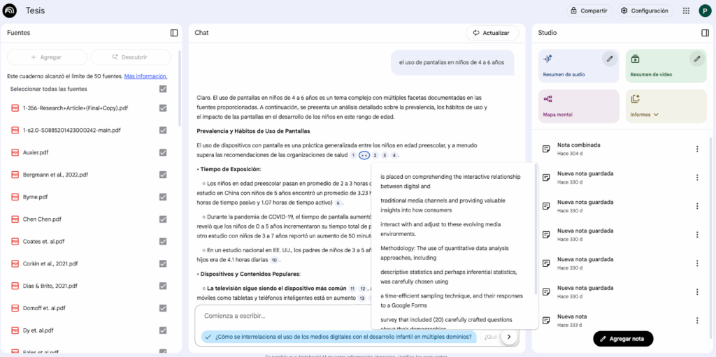 También utilicé mucho NotebookLM un asistente de investigación impulsado por IA de Google que te permite cargar tus documentos, organizarlos, interactuar con ellos, y recibir resúmenes, guías, timelines y hasta te crea pódcast basados en el contenido que provees. En mi caso, teniendo 50 fuentes en mi marco teórico, constantemente olvidaba quien había dicho qué, entonces le podía preguntar a ChatGPT, por ejemplo, sobre el uso de las pantallas en niños de cuatro a seis años y me daba un resumen con las referencias donde sacó la información, así podía yo acceder la lectura y buscar la cita textual.